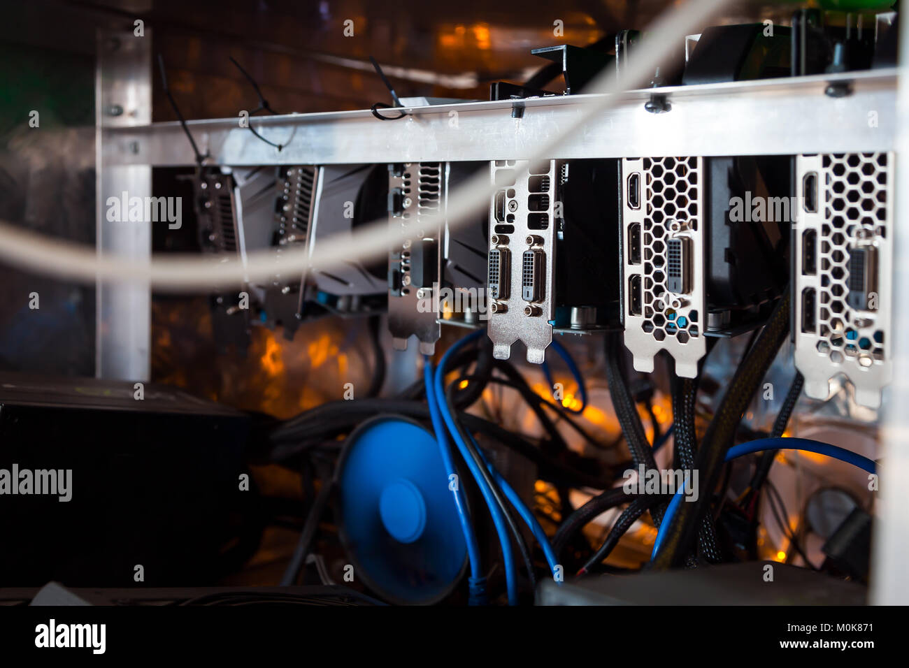 Farm For Mining Crypto Currency On Video Cards Close Up Device