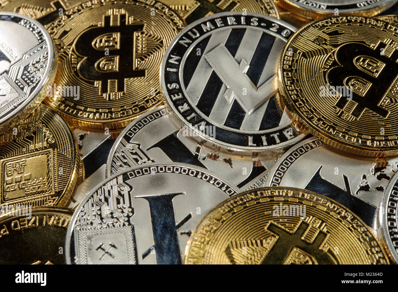 Cryptocurrency Concept Rich Stack Of Bitcoins Litecoins And