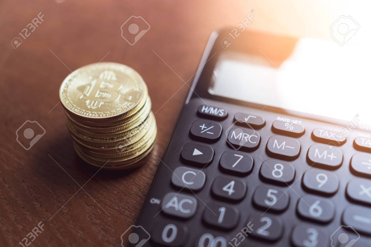 Calculator And A Stack Of Bitcoins Coins As Symbol Of